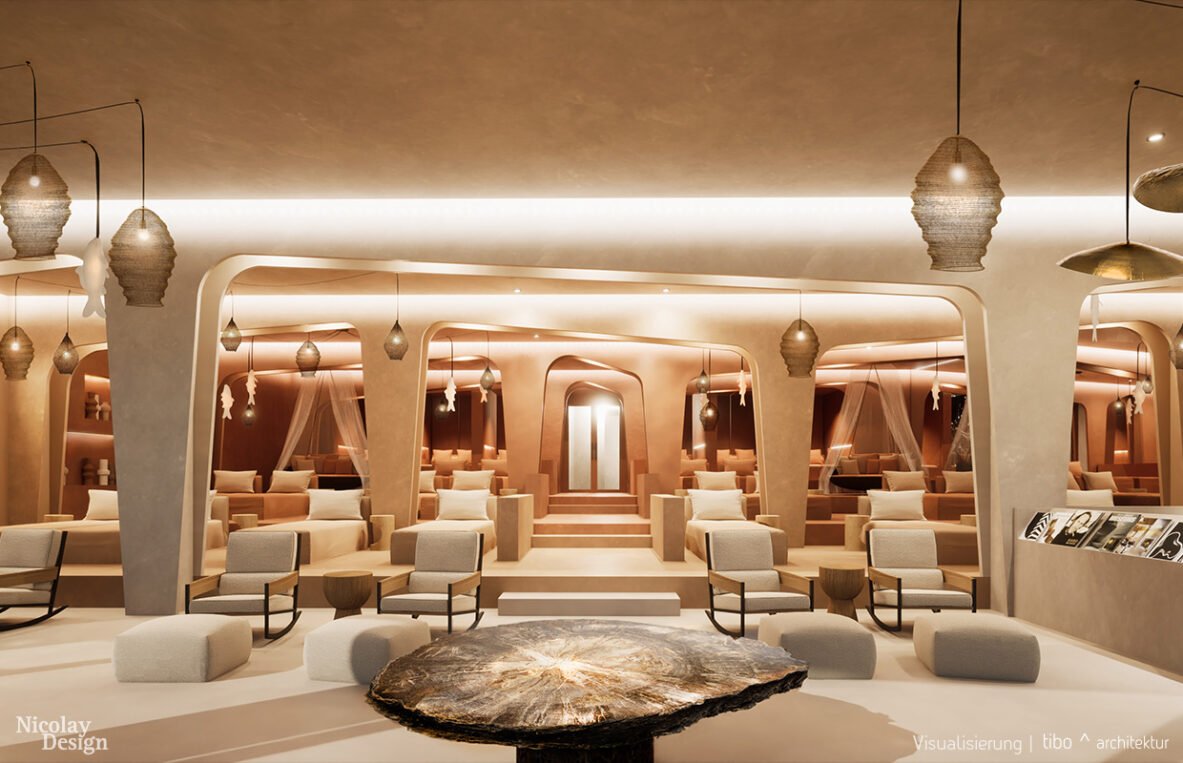 Der neue Ruheraum schafft durch seinen terrassenförmigen Aufbau im Innenraum spannende Blickbezüge und öffnet sich durch seine trichterförmige Architektur zum Außenraum und dem See hin. Die räumliche Abtrennung der einzelnen Ebenen durch organisch geformte Bögen, schafft für den Besucher geschützte Bereiche zum Wohlfühlen und Entspannen. Der Farbverlauf aus Erdtönen wird zur Fassade hin immer heller und schenkt dem Raum eine spannende Tiefe.